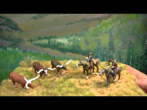 Laurie Mclean }}- I finished the 3rd longhorn bull and created a diorama showing 3 cattle and the 2 cowboys on horse's. This is O scale using Aspen Models figures and the grass ...